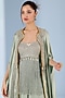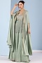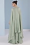 Featuring a teal green cape in chamois satin base. It is paired with a raw silk bustier and silk satin embroidered palazzo pants. Accentuate it with statement jewellery or heels for a cocktail, sangeet or engagement ceremony.