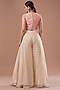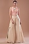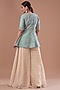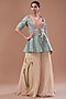 Featuring a teal green jacket in raw silk base with embroidery. It is paired with a brick blouse and beige chiffon printed palazzo pants. Accentuate it with statement jewellery and heels for a festive occasion or sangeet ceremony.