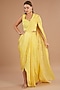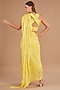Featuring a yellow pre-stitched saree in chamoise satin base with print. It is paired with a striped embroidered blouse. Accentuate with statement jewellery and heels for a festive occasion or haldi ceremony.