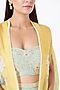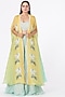 Featuring a mint green bustier organza base with moti jaal work. It is paired with pleated palazzo pants and a yellow cape. Accentuate it with statement jewellery and heels for a festive look.