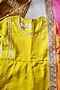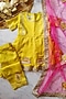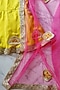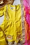 Featuring a yellow anarkali for girls in summer silk base with gota applique embroidery. It is paired with straight pants and a pink net dupatta. Style it with sandals and cute hair accessories for a wedding, sangeet or festive ceremonies.