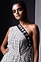Featuring a black and off white one shoulder cape in cotton base with mirror hand embroidery. It is paired with a matching tube top and printed pants.