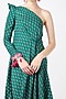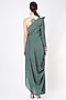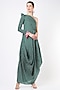 Featuring an ink green one-shoulder cowl dress in muslin base with a puffed sleeve including floral print and mirror embroidery.