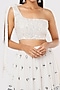 Featuring an off-white layered lehenga in cotton base with mirror buttis embroidery and floral print. It is paired with a matching one-shoulder blouse having sequins embroidery.