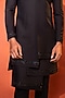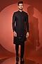Featuring a black achkan jacket in premium suiting fabric base with cutdana and thread embroidery. It is paired with slim trousers. Perfect wear for a wedding, sangeet, or engagement ceremony.