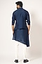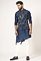 Featuring a blue nehru jacket in bam silk base with chain stitch and french knot work. It is paired with an asymmetric kurta and malai cotton pyjama pants. Perfect wear for festive occasions.