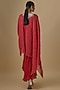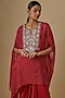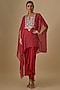Featuring a red kaftan in georgette, shantoon and net base with leheriya print, metallic thread and mirror work. It is paired with a camisole and crepe dhoti pants. Accentuate it with statement earrings and heels for a brunch or casual outing.