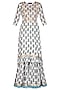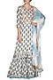 Featuring an ivory straight kurta in muslin and shantoon base with blue block printed and frills at the bottom. It is paired with matching sharara pants and leheriya dupatta in crepe base having gota work.