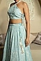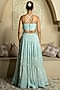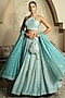 Featuring a firozi blue lehenga in silk and organza base with pearl work. It is paired with a blouse, dupatta and potli bag. Accentuate it with dangler earrings and heels for sangeet, engagement or wedding ceremony.
