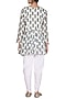 Featuring an ivory peplum kurta in muslin base with gota work and block print. It is paired with matching dhoti pants in crepe base and dupatta in georgette base.