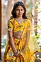 Featuring a yellow lehenga for girls in chanderi base with floral print. It is paired with a half sleeves blouse, a net dupatta and a potli bag. Style it with cute hair accessories and sandals for a festive occasion or wedding ceremony.