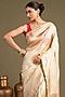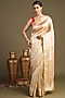 Featuring a beige banarasi handloom saree in pure katan silk base with block print and hand embroidery. It is paired with an unstitched blouse piece. Accentuate it with kundan polki or gold jewellery, embellished heels and a potli bag for haldi celebrations or intimate wedding ceremonies.