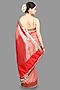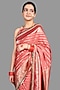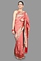 Featuring a blush-red handloom banarasi saree in pure katan silk base with hand embroidery. It is paired with an unstitched blouse. Accentuate it with kundan polki or gold jewellery, embellished heels and a potli bag for a wedding ceremony.