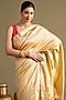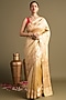 Featuring a gold banarasi handloom saree in pure katan silk organza base with floral print and hand embroidery. It is paired with an unstitched blouse piece. Accentuate it with kundan polki or gold jewellery, embellished heels and a potli bag for haldi celebrations or intimate wedding ceremonies.
