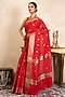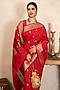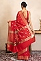 Featuring a red saree in chiffon banarasi base with zari detail. It is paired with an unstitched blouse. Style it with kundan jewellery, potli and heels, perfect for a festive occasion, wedding or engagement ceremony.