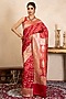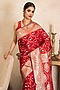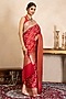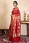 Featuring a red handwoven saree in pure katan satin banarasi base with zari detail. It is paired with an unstitched blouse. Style it with kundan jewellery, potli and heels, perfect for a festive occasion, wedding or engagement ceremony.