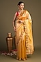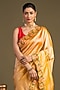 Featuring a yellow banarasi handloom saree in pure tissue silk base with hand embroidery and floral leaf print. It is paired with an unstitched blouse piece. Accentuate it with kundan polki or gold jewellery, embellished heels and a potli bag for grand celebrations or intimate wedding ceremonies.