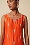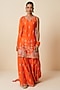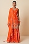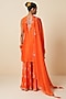 Featuring an orange kurta in pure chanderi silk base with jaal embroidery. It is paired with embroidered sharara pants and a pure organza dupatta. Accentuate it with statement earrings, sleek heels, and a clutch for an elegant look, perfect for receptions or festive gatherings.