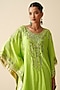 Featuring a parrot green kaftan in muslin base with embroidery. It is paired with pants. Accentuate it with statement earrings and heels for festive occasions.