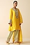 Featuring a yellow kurta in mul chanderi base with embellishment. It is paired with pista green cotton silk pants and a dupatta. Accentuate it with statement earrings, sleek heels, and a clutch for an elegant look, perfect for receptions or festive gatherings.