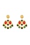 Featuring a pair 22 Kt gold plated stud earrings studded with black onyx, malachite, and red coral, set in brass.