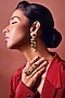 Featuring a pair of gold finish dangler earrings studded with emerald green stones, set in brass. Perfect for sangeet nights, cocktail parties or evening celebrations.