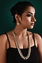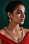 Featuring a gold finish long temple necklace studded with multi-colored stones, set in mixed metal. It is paired with a matching pair of earrings. Perfect choice for weddings and other Indian festivities.