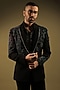 Featuring a black tuxedo jacket in korean lycra base with crystal, cutdana, and rainbow nalki embellishments, including galaxy hand painting. It is paired with trousers. Style it with loafers and a watch for weddings or cocktail ceremonies.