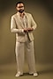Featuring a white tuxedo jacket in jacquard base with sequins and cutdana embroidery. It is paired with satin trousers. Style it with loafers and a watch for weddings or cocktail ceremonies.