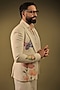 Featuring a white tuxedo jacket in korean lycra base with cutdana embroidery, including floral and butterfly hand painting. It is paired with trousers. Style it with loafers and a watch for weddings or cocktail ceremonies.