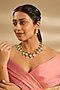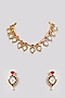 Featuring a gold finish enameled necklace studded with black kundan polki, ruby and pearl drops, set in mixed metal. It is paired with a matching pair of earrings. Perfect for festive occasions, weddings or cultural events, this jewellery is a wardrobe must for those who love to shine effortlessly.