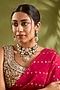 Featuring a gold finish choker necklace studded with green kundan polki, set in mixed metal. It is paired with a matching pair of earrings. Perfect for festive occasions, weddings or cultural events, this jewellery is a wardrobe must for those who love to shine effortlessly.