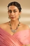 Featuring a gold finish long necklace studded with carved elephant motifs, kundan polki, pearls, ruby and emerald stones, set in mixed metal. It is paired with a matching pair of earrings. Perfect for festive occasions, weddings or cultural events, this jewellery is a wardrobe must for those who love to shine effortlessly.
