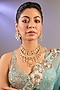 Featuring a gold finish layered necklace studded with moissanite polki, set in mixed metal. It is paired with a matching pair of earrings. Perfect choice for weddings, parties and for other Indian festivities.