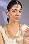 Featuring a gold finish necklace studded with moissanite stones, set in brass. It is paired with a matching pair of earrings and a maangtikka. Perfect for wedding celebrations, festive soirees or cultural gatherings adding a regal charm to every look.