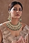 Featuring a 22kt gold plated necklace studded with green kundan polki and pearl hangings, set in mixed metal. It is paired with a matching pair of earrings. Perfect wear for festive occasions or wedding ceremonies.