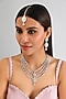 Featuring a white finish layered necklace studded with diamonds, set in mixed metal. It is paired with a matching pair of earrings and a maangtikka. Perfect wear for a wedding or festive occasion.