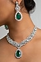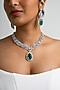 Featuring a gold finish necklace studded with american diamonds and green stones, set in mixed metal. It is paired with a matching pair of earrings. Perfect choice for festive celebrations or other Indian festivities.
