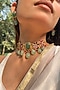 Featuring a 18kt gold plated choker necklace studded with jadau kundan polki, set in brass. It is paired with a matching pair of earrings. Perfect wear for festive occasions or wedding ceremonies.