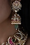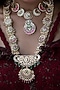 Featuring a 18kt gold plated long necklace studded with jadau kundan polki, set in brass alloy. It is paired with a matching pair of earrings. Perfect wear for festive occasions or wedding ceremony.