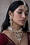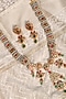 Featuring a 18kt gold plated necklace studded with jadau kundan polki, set in brass alloy. It is paired with a matching pair of earrings. Perfect wear for festive occasions or wedding ceremony.