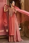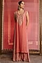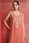 Featuring a coral kurta in foil georgette base with embroidery and mirror work. It is paired with crushed tissue hand embellished pants, a bustier and an organza dupatta. Accentuate it with statement jewellery, a potli bag and embellished heels, ideal for a sangeet, wedding or engagement ceremony.