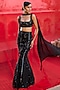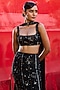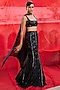 Featuring a midnight black fish-cut lehenga in soft georgette base with aari hand embroidery. It is paired with a blouse and a flat chiffon scarf. Accentuate it with statement jewellery, a potli bag and embellished heels, ideal for a sangeet, wedding or engagement ceremony.