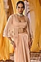 Featuring a peach jacket in net base with hand embroidery. It is paired with a satin skirt and a hand embroidered bustier. Accentuate it with statement jewellery, a potli bag and embellished heels, ideal for a sangeet, wedding or engagement ceremony.
