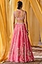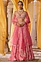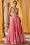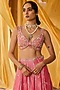 Featuring a pink lehenga in tissue base with hand embroidery. It is paired with an aari hand embroidered blouse and an organza dupatta. Accentuate it with statement jewellery, a potli bag and embellished heels, ideal for a festive occasion, sangeet, wedding or engagement ceremony.