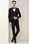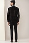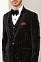 Featuring a black tuxedo in velvet base with swarovski embroidery. It is paired with a satin vest, a cotton shirt, terry rayon trousers and a bow. Perfect wear for a reception or engagement ceremony.