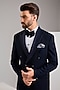 Featuring a blue double breasted tuxedo in jacquard base. It is paired with trousers, a shirt and a bowtie. Style it with loafers for a reception, sangeet, engagement or wedding ceremony.