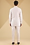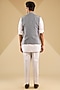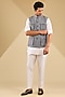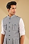 Featuring a powder blue bundi jacket in linen blend suiting base with puffed up patch pockets. It is paired with an off-white kurta and poly silk pants. Style it with loafers for a royal and refined look, perfect for a haldi, engagement or sangeet ceremony.