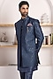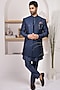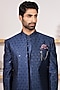 Featuring a midnight blue indo-western in jacquard and poly cotton base. It is paired with matching pants, a kurta, pocket square and a brooch.