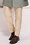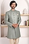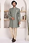 Featuring a spring green indo-western in jacquard and poly cotton base with geometric print and embroidery. It is paired with contrasting pants, a pocket square and a brooch.